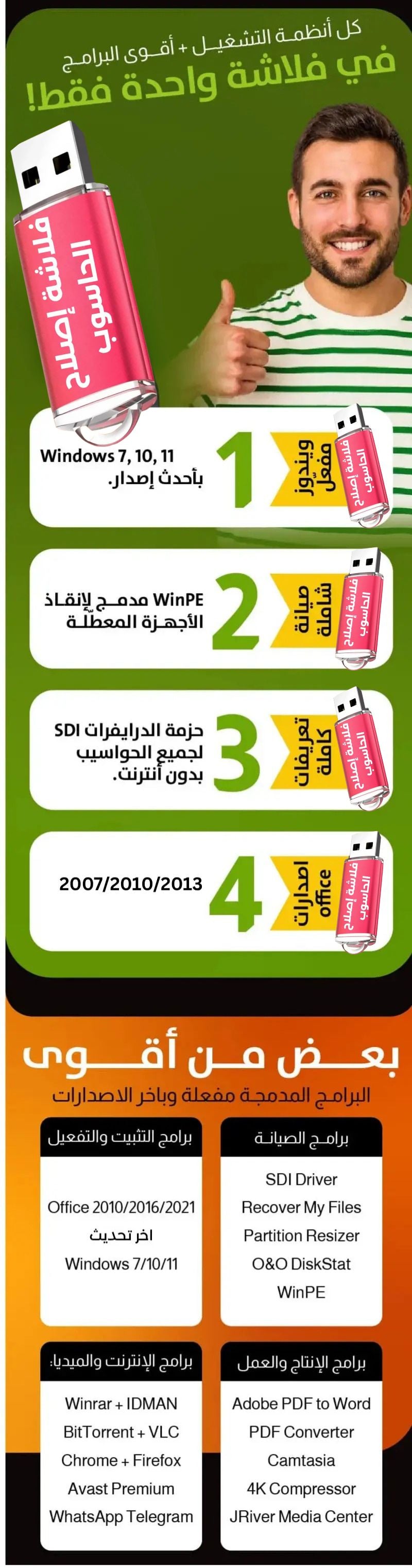 هاد الفلاشة فيها جميع الأدوات اللي كتحتاج باش تصلّح المشاكل الشائعة فـ Windows: إصلاح النظام، استرجاع الملفات، حذف الفيروسات، وإنشاء USB إقلاعي باش تفرمت الحاسوب. ساهلة، آمنة، ومجّربة.